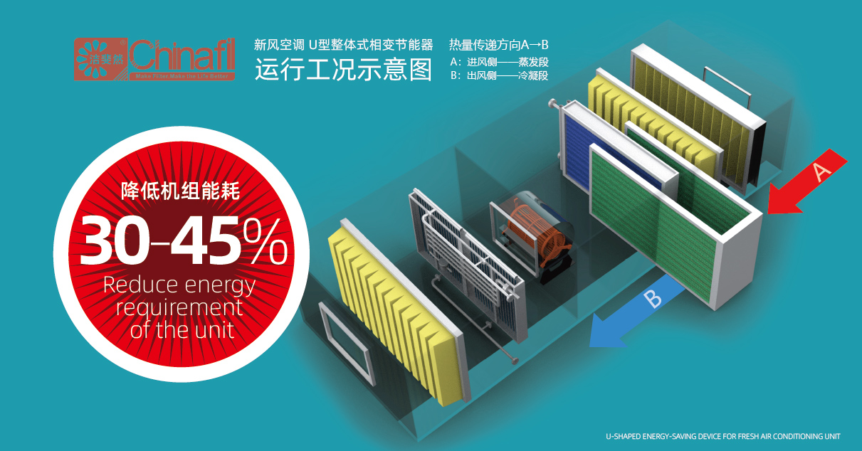 EBPay新风空调专用U型节能器,它采用相变传热技术,通过两组换热器分别位于表冷前后,在热季实现高效的热量传递和节能效果。以10000CMH新风空调为例,热季节能效果:当新风空调为电再热形式时,一个完整热季约可省电50000元;当新风空调再热盘管热源为燃气的时候,一个完整热季约可省电40000元;当新风空调使用蒸汽再热时候,一个完整热季约可省电30000元。