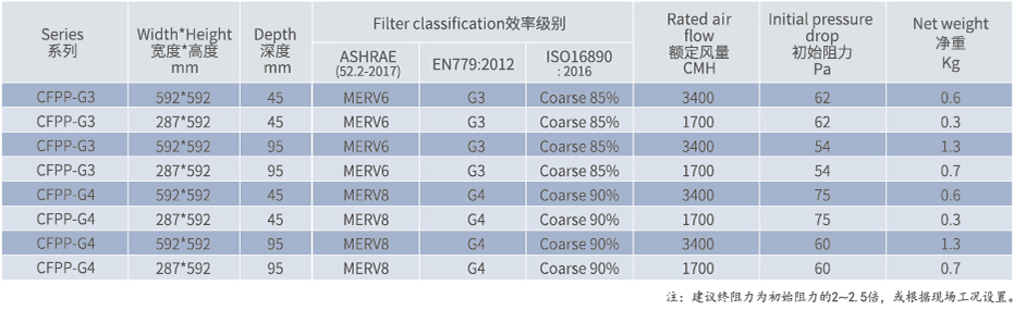 建议终阻力:220Pa@2.5m/s;